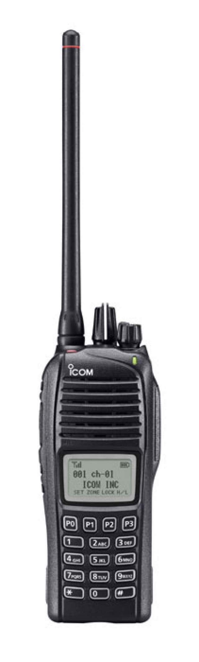 Using a large full dot-matrix LCD (32 × 18mm), the IC-F3262D series shows two lines of easy-to-read text messages. The bottom row shows assigned functions to the [P0] to [P3] buttons.